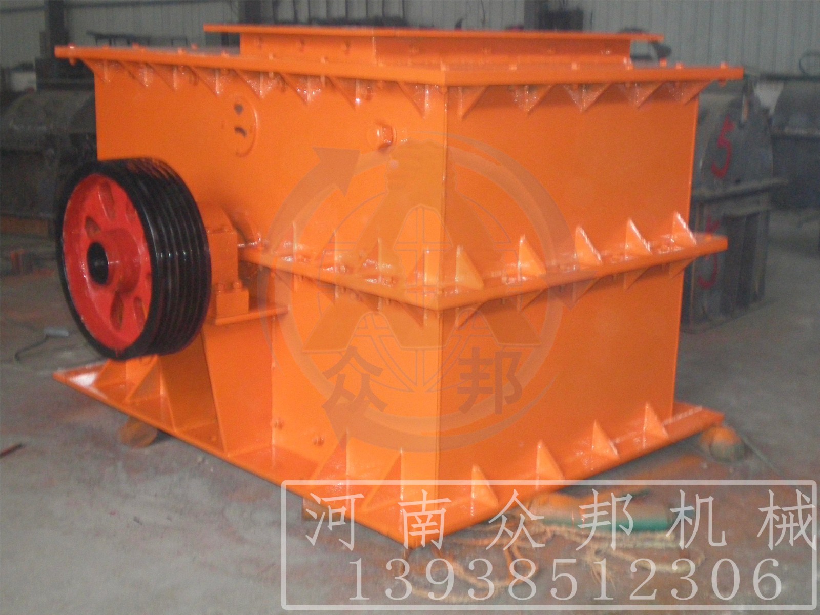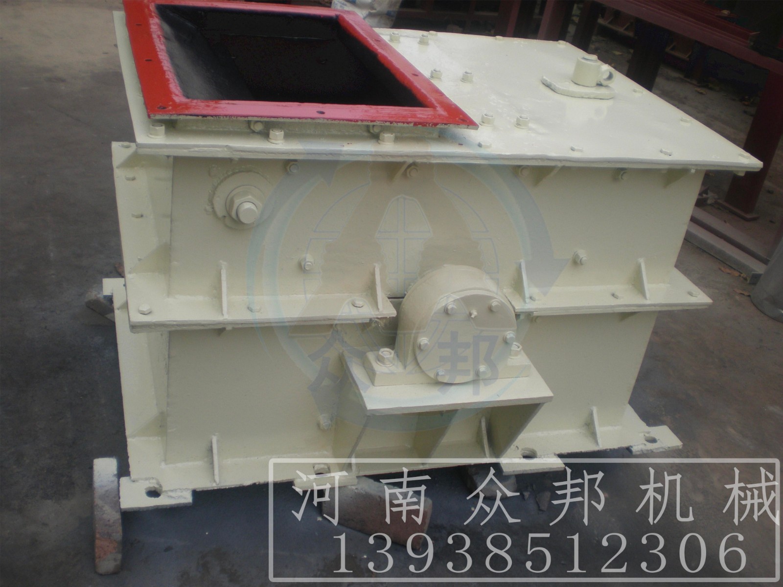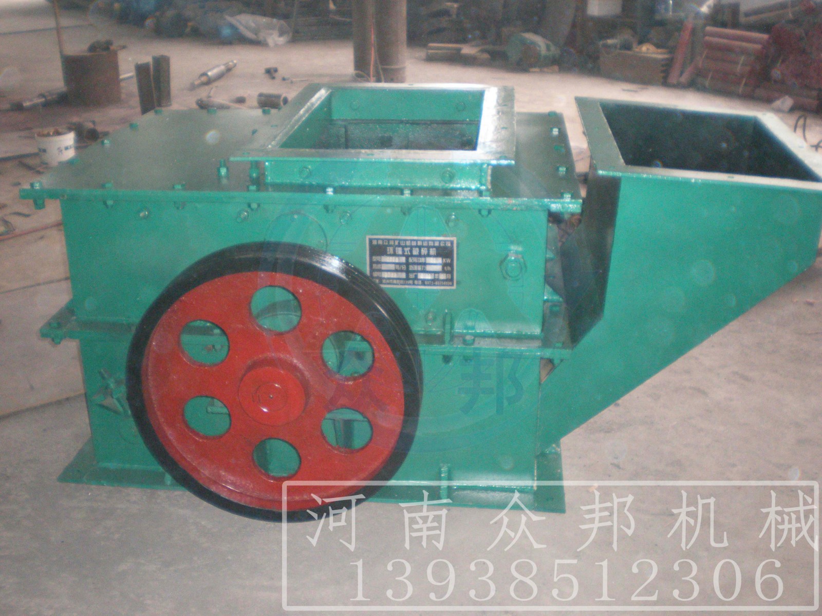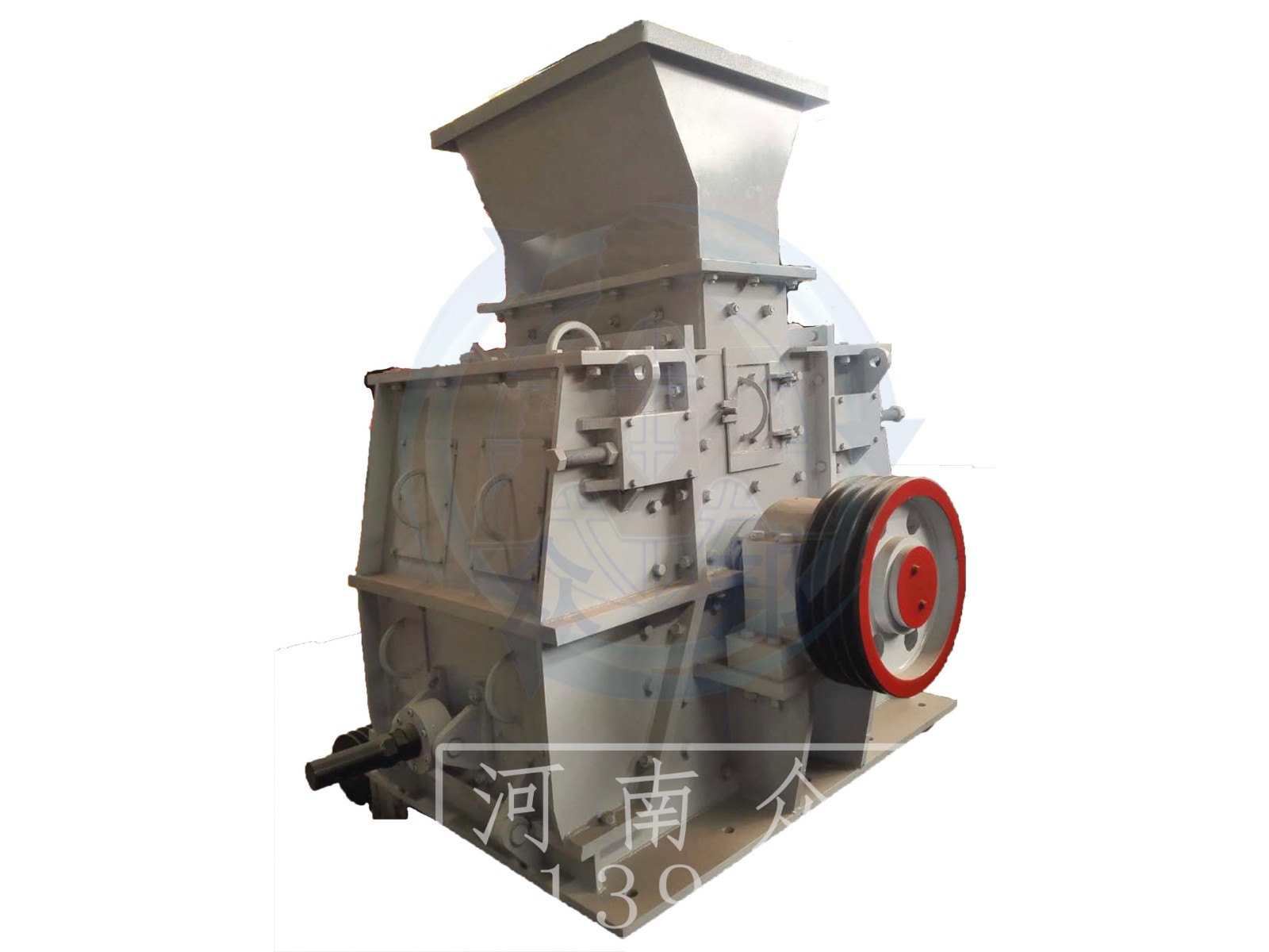 環(huán)錘式破碎機(jī)的工作部件為帶有錘子(又稱錘頭)的轉(zhuǎn)子。轉(zhuǎn)子由主軸、圓盤、銷軸和錘子組成。電動機(jī)帶動轉(zhuǎn)子在破碎腔內(nèi)高速旋轉(zhuǎn)。物料自上部給料口給入機(jī)內(nèi),受高速運(yùn)動的錘子的打擊、沖擊、剪切、研磨作用而粉碎。在轉(zhuǎn)子下部,設(shè)有篩板、粉碎物料中小于篩孔尺寸的粒級 通過篩板排出,大于篩孔尺寸的粗粒級 阻留在篩板上繼續(xù)受到錘子的打擊和研磨,通過篩板排出。